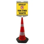 Çift reflektifli trafik konisi üzerine kolaylıkla montajlanabilen, 34×40 levha üzerine müşterilerin isteğine göre çift taraflı veya tek taraflı baskı yapılır. Koni yüksekliği 90 cm ve levha yüksekliği 40 cm’dir. Toplamda setimizin uzunluğu 130 cm’dir. Toplam ağırlığı 6 kg gelmektedir.